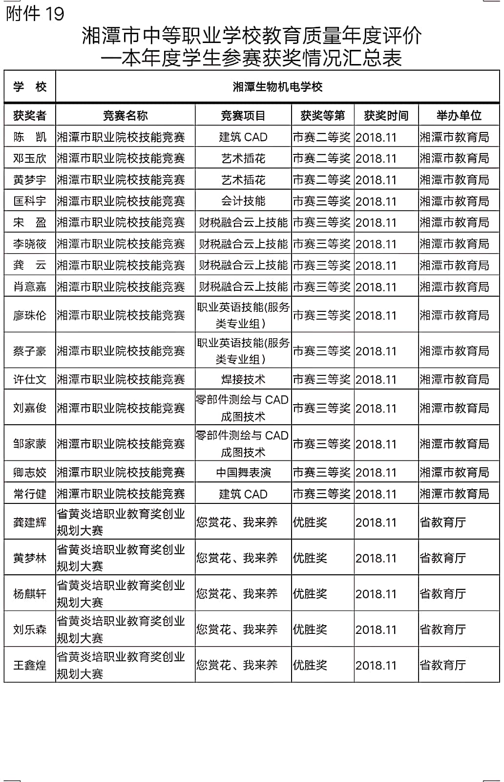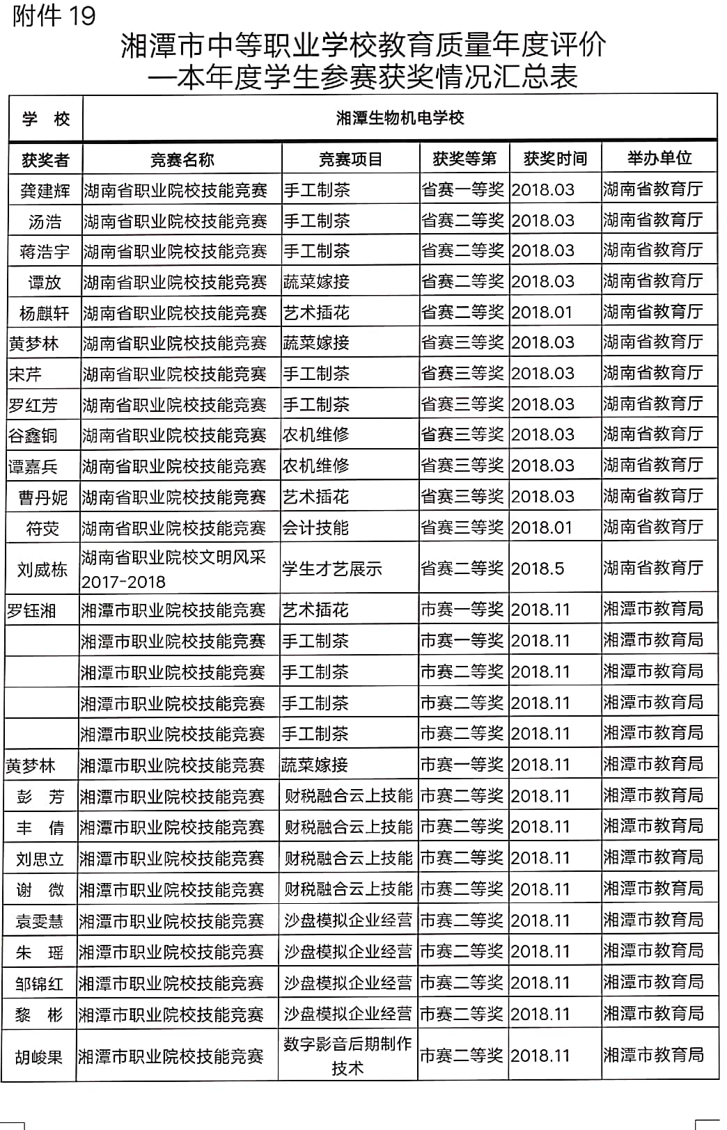2018年度学校学生参加各级各类赛获奖情况汇总表 - 教学科研 - 湘潭生物机电学校