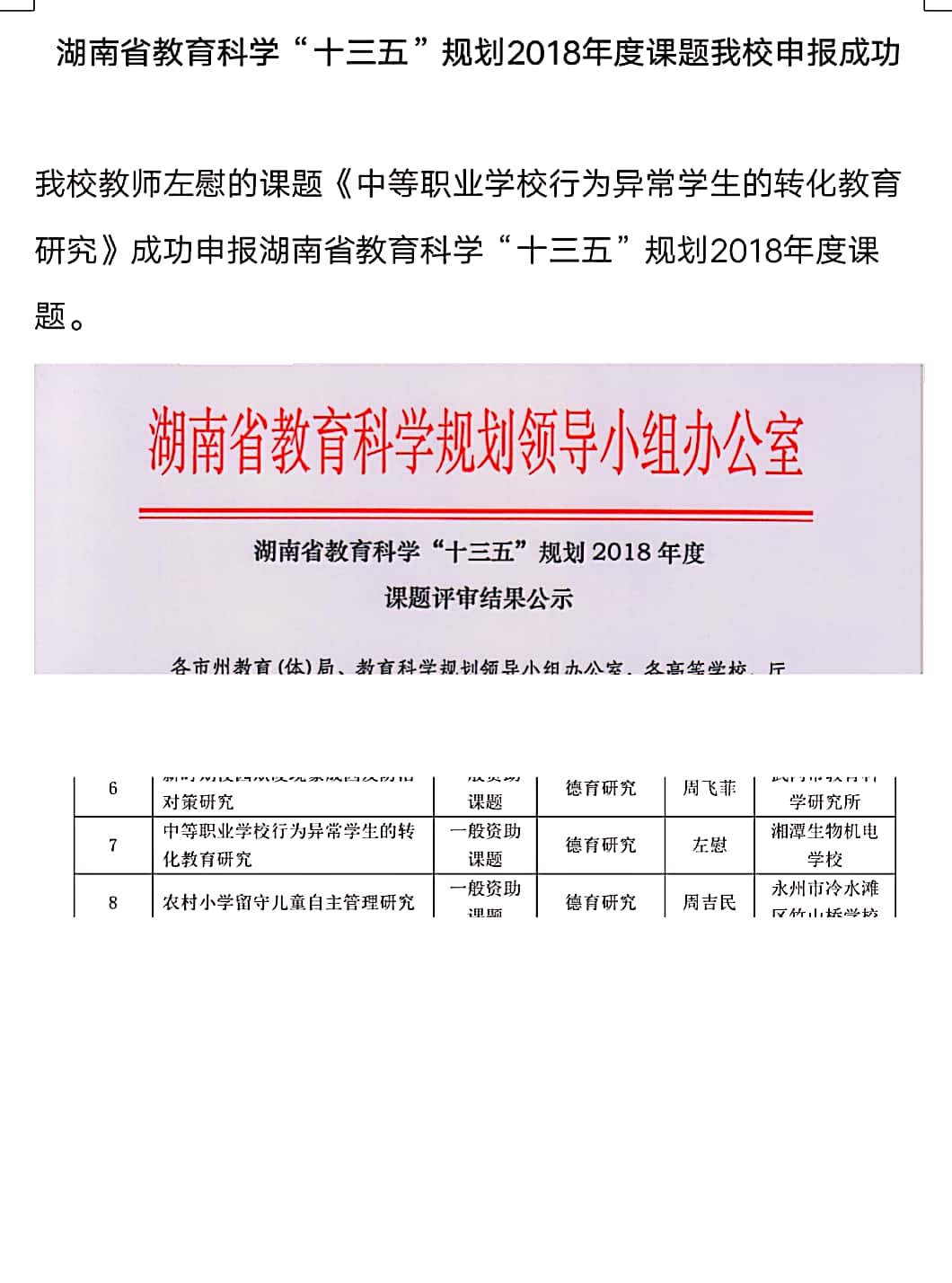 湖南省教育科学“十三五”规划2018年度课题我校申报成功 - 教学科研 - 湘潭生物机电学校
