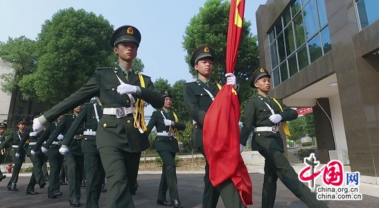 在催人奋进的进行曲音乐下,英姿飒爽的国旗护卫队队员们迈着整齐的步伐护送鲜艳的五星红旗进场。校团委副书记刘胜雄老师宣布:“升国旗,奏唱国歌,全体行注目礼!”伴着庄严嘹亮的国歌,五星红旗冉冉升起,全体师生怀着崇敬与喜悦的心情,凝视着迎风飘扬的五星红旗,心中无比自豪。