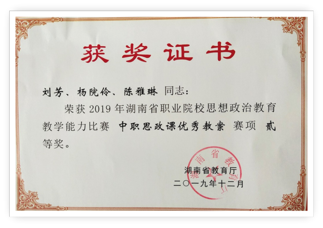 刘芳,中共党员,全日制本科学历,思想政治教育专业法学学士学位, 2019年参加湖南省职业院校思想政治教育教学能力比赛获二等奖。