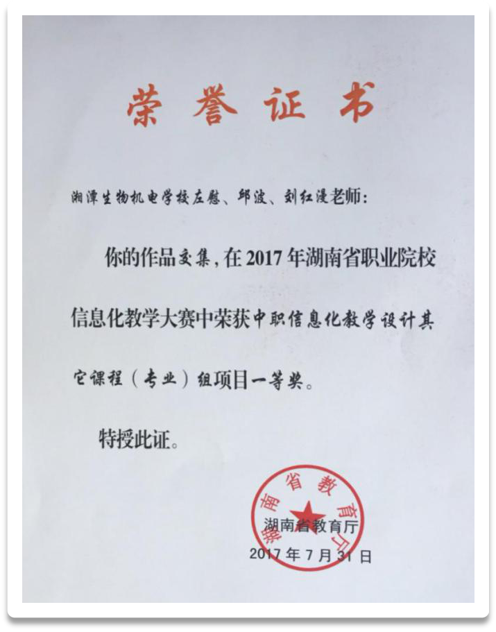 近三年,教师们荣获湖南省教育教学比赛一等奖1个,二等奖4个,三等奖6个;荣获湘潭市教育教学比赛一等奖12个,二等奖9个,三等奖10个。三年中,陆续指导学生参加湘潭市中等职业学校教育教学能力比赛获一等奖5个,二等奖9个,三等奖16个。湖南省文明风采大赛中获得5个奖项。德育工作非常突出,涌现出一批市级优秀德育工作者、优秀团支部辅导员、未成年思想道德建设先进个人。